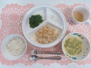 (写真は離乳食後期です。年齢によって形、固さ、盛り付け量を変えて、提供しています。)