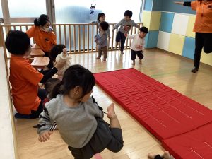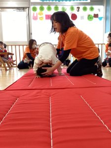 安全上保育士が必ず補助をして取り組んでいるのですが、補助の力を入れなくとも自分で回れるくらいに、どんどん前転が上達し様になってきています♪