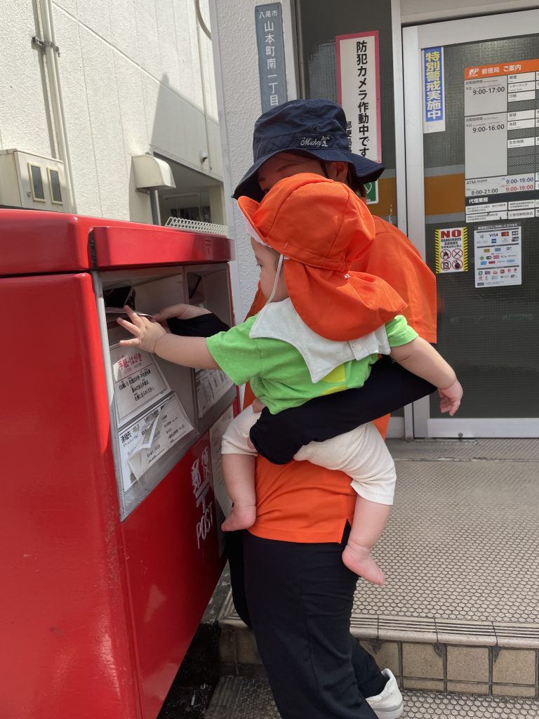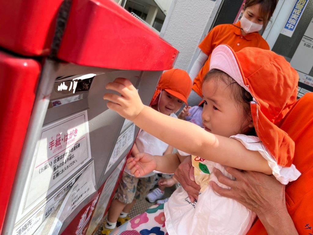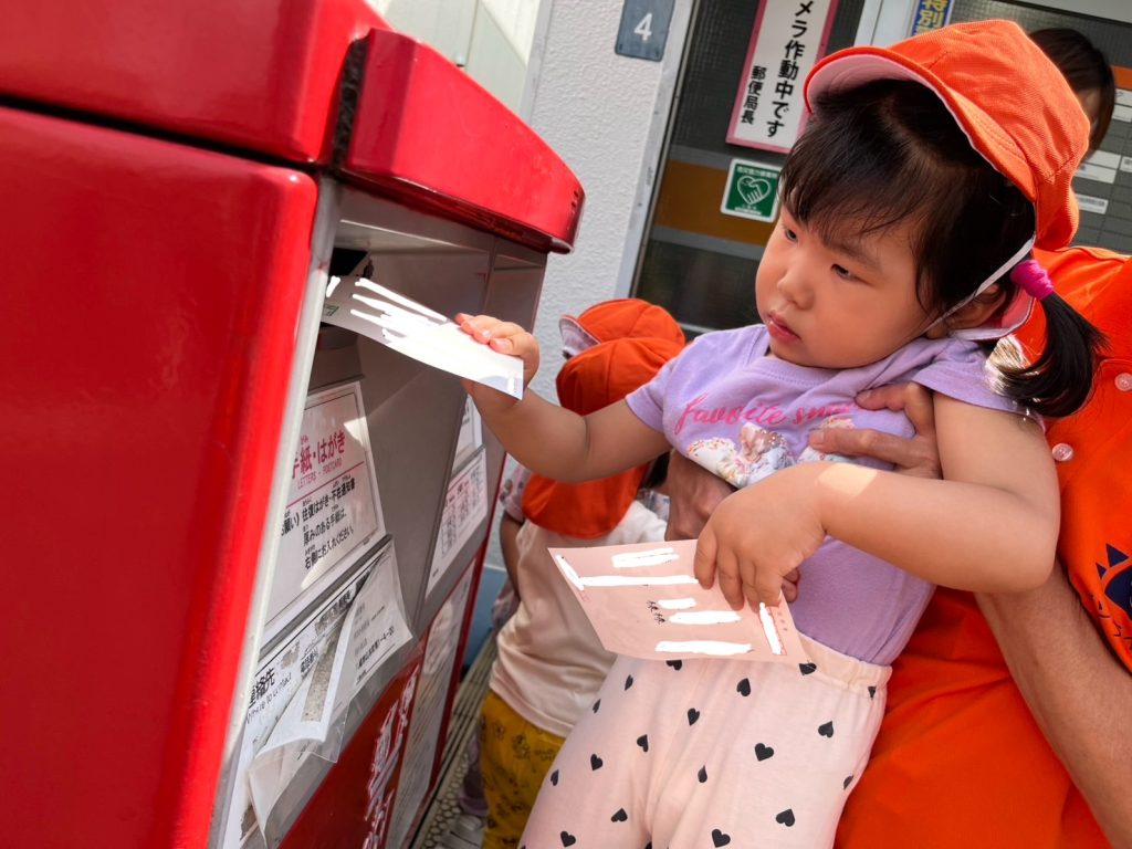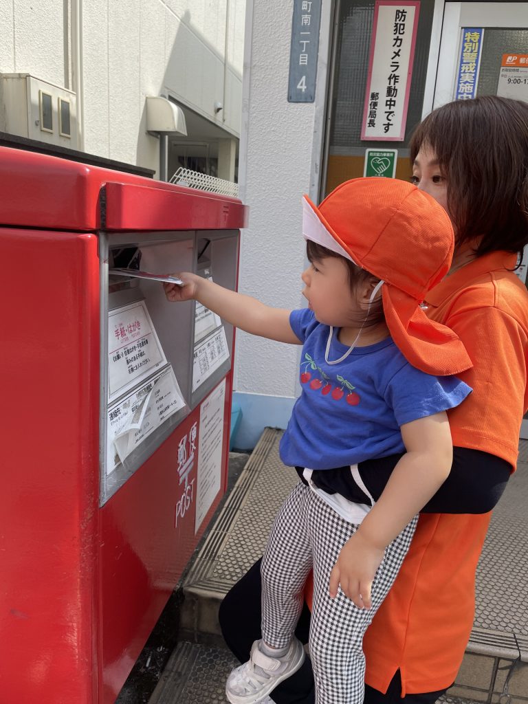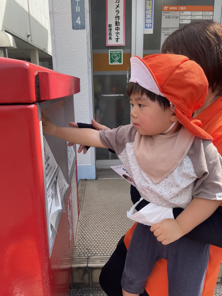 自分でポストに投函ぎ難しいもも組のお友だちもハガキに手を伸ばしたり、手を添えて一緒に入れることができましたよ😊