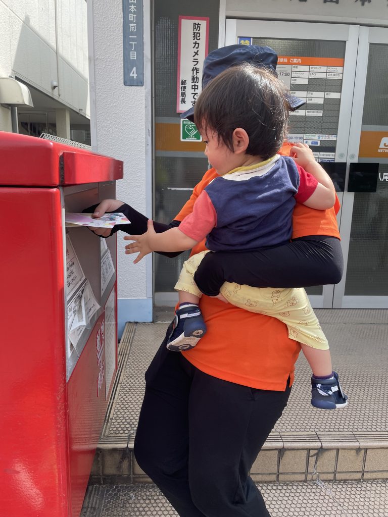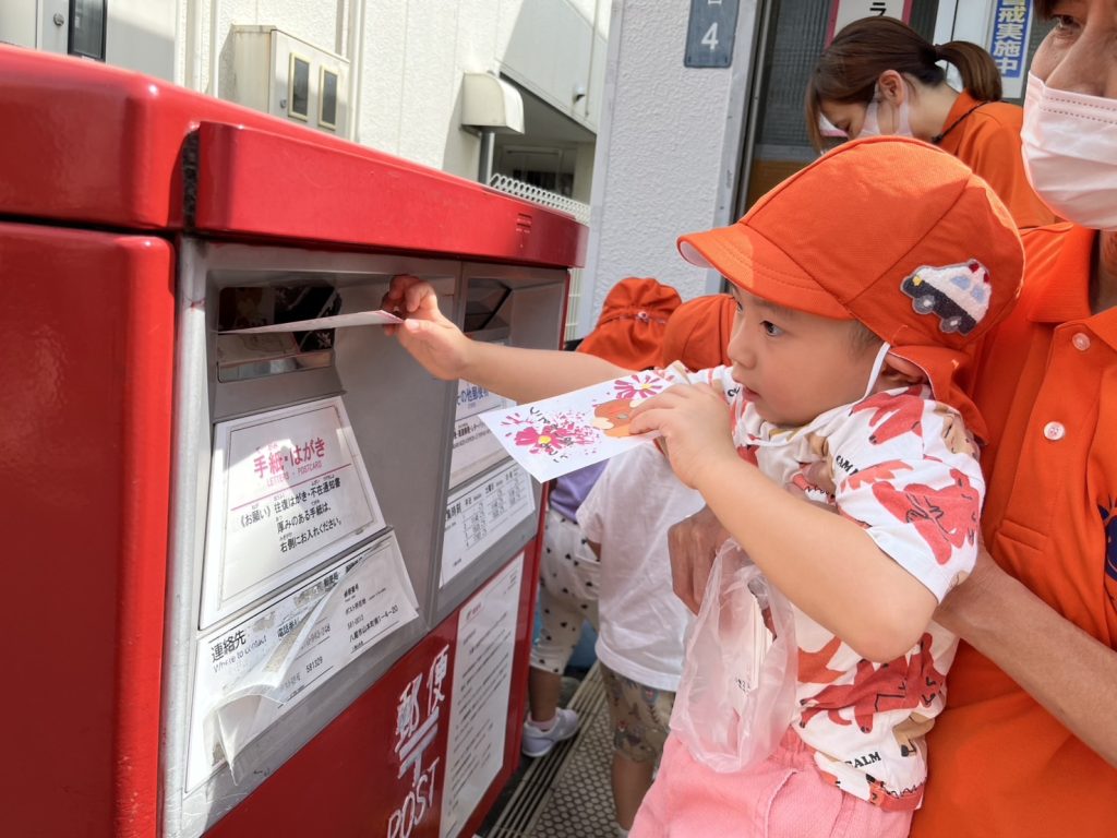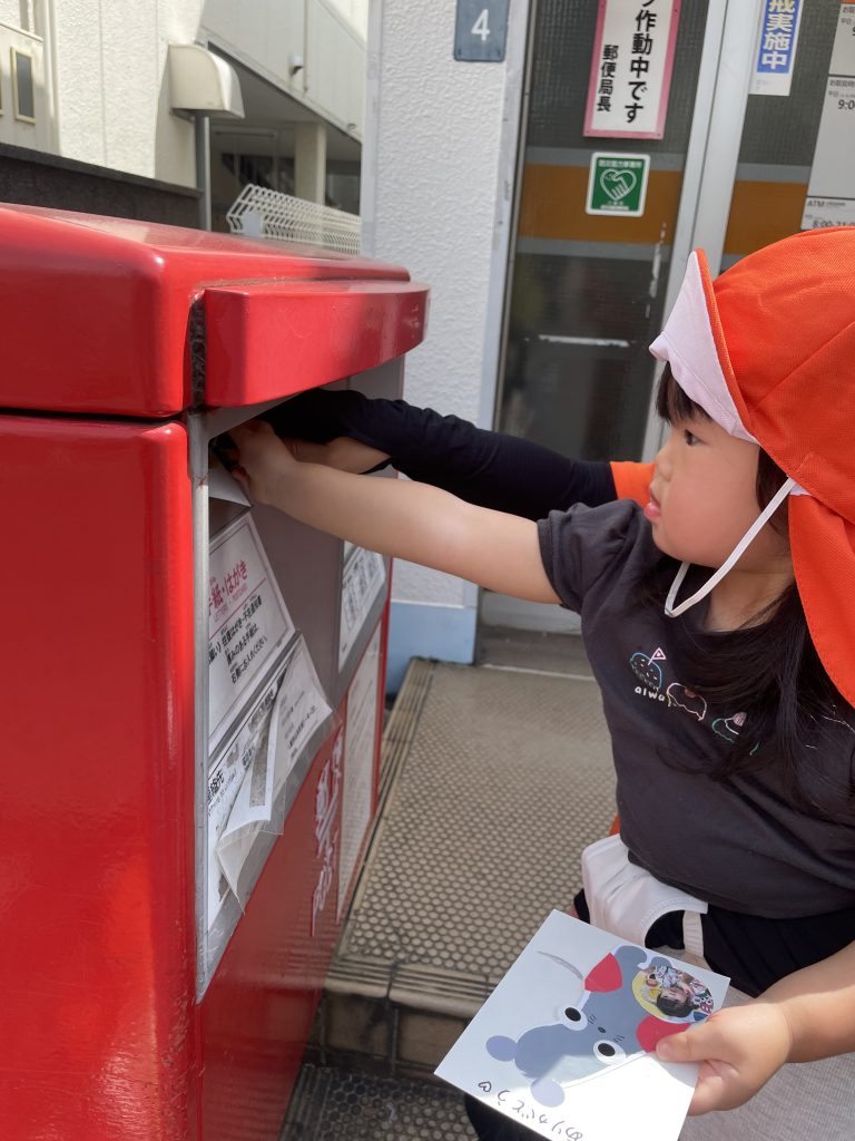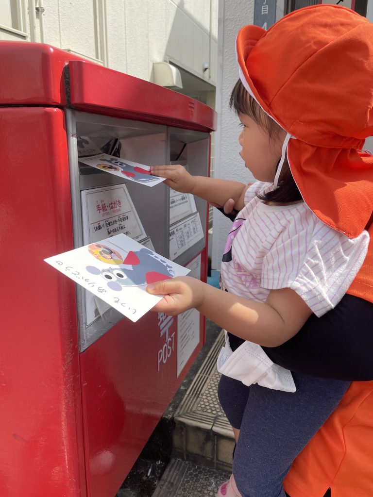一人ずつポストにハガキを入れる中で「じいじ、ばあばに届くかな」「入った!!」と嬉しそうな子どもたち🧒👦