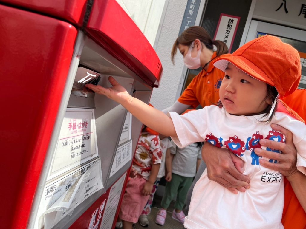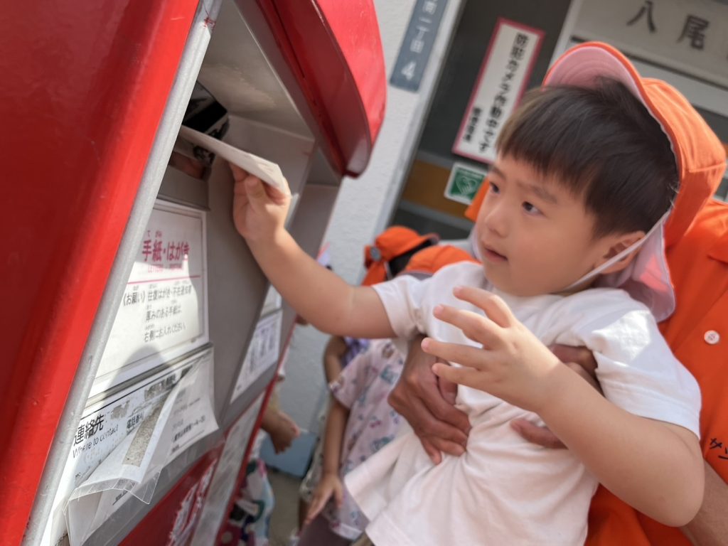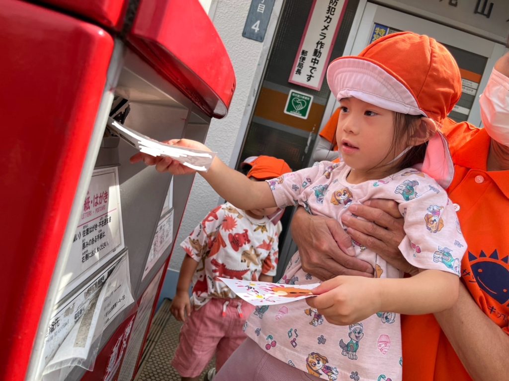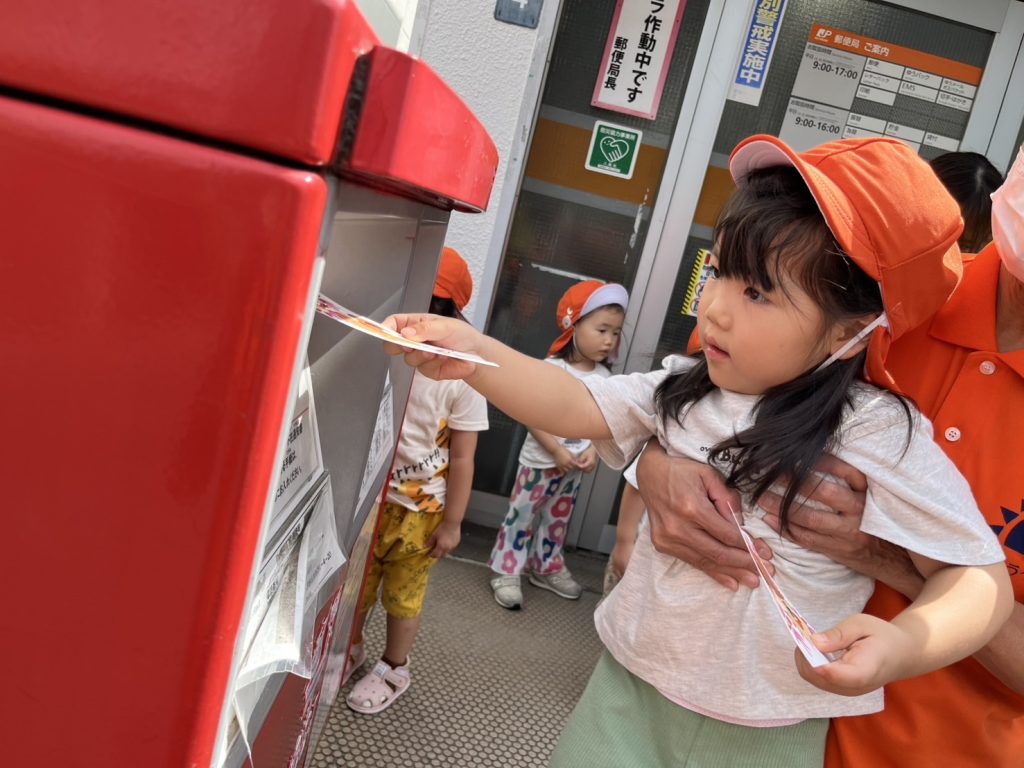 一人ずつポストにハガキを入れる中で「じいじ、ばあばに届くかな」「入った!!」と嬉しそうな子どもたち🧒👦