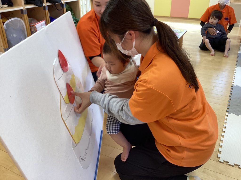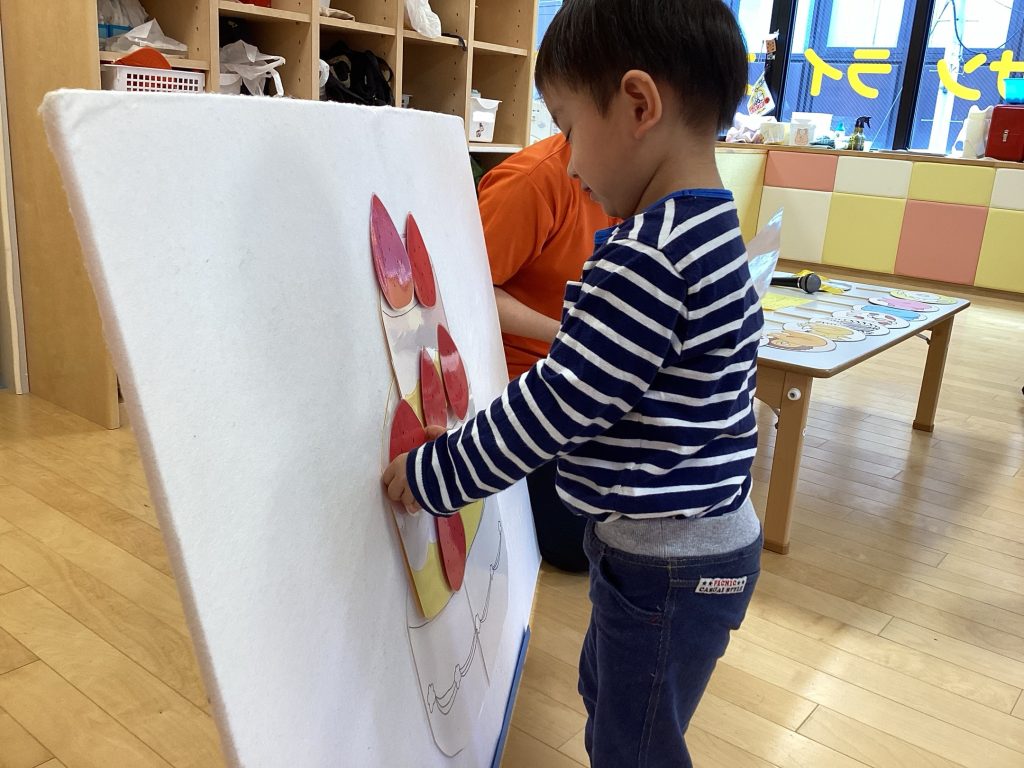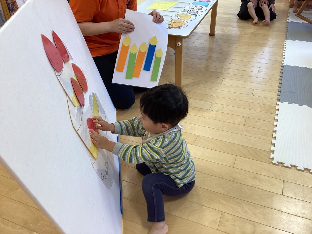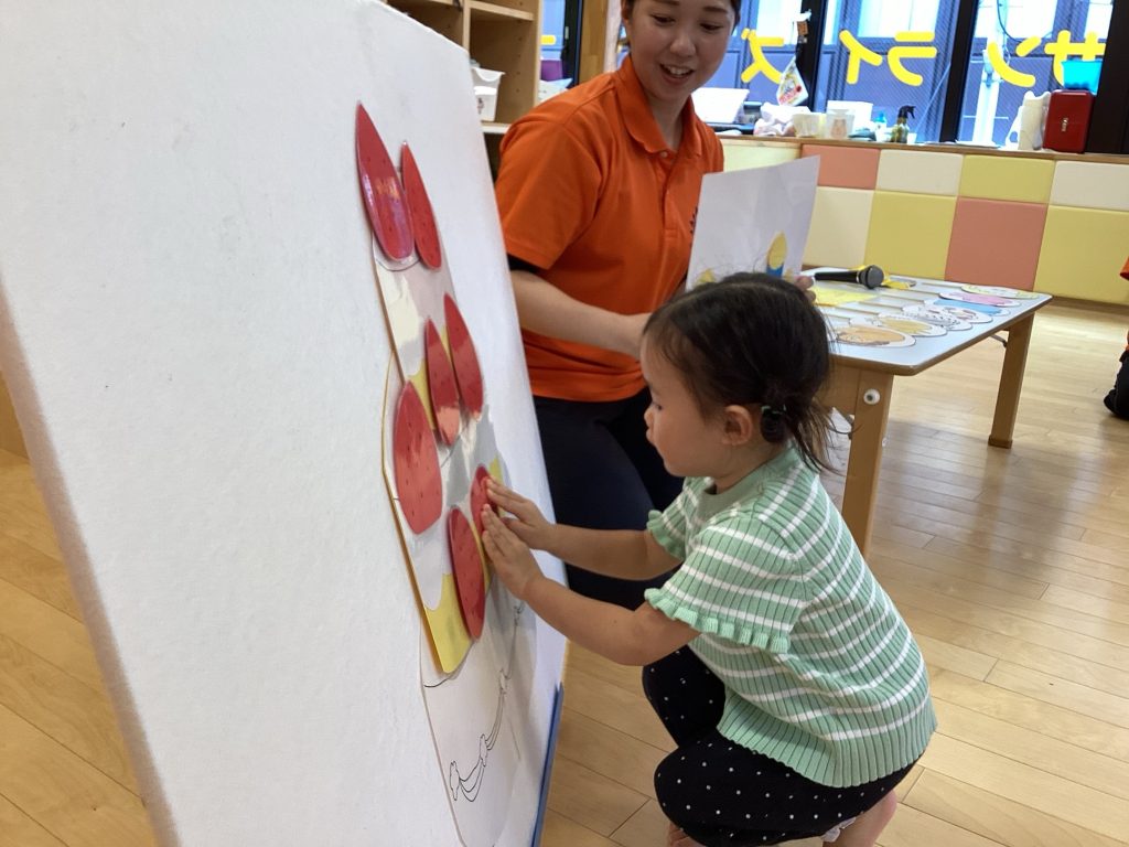 保育者と一緒に貼ってみるもも組のお友だち🍑