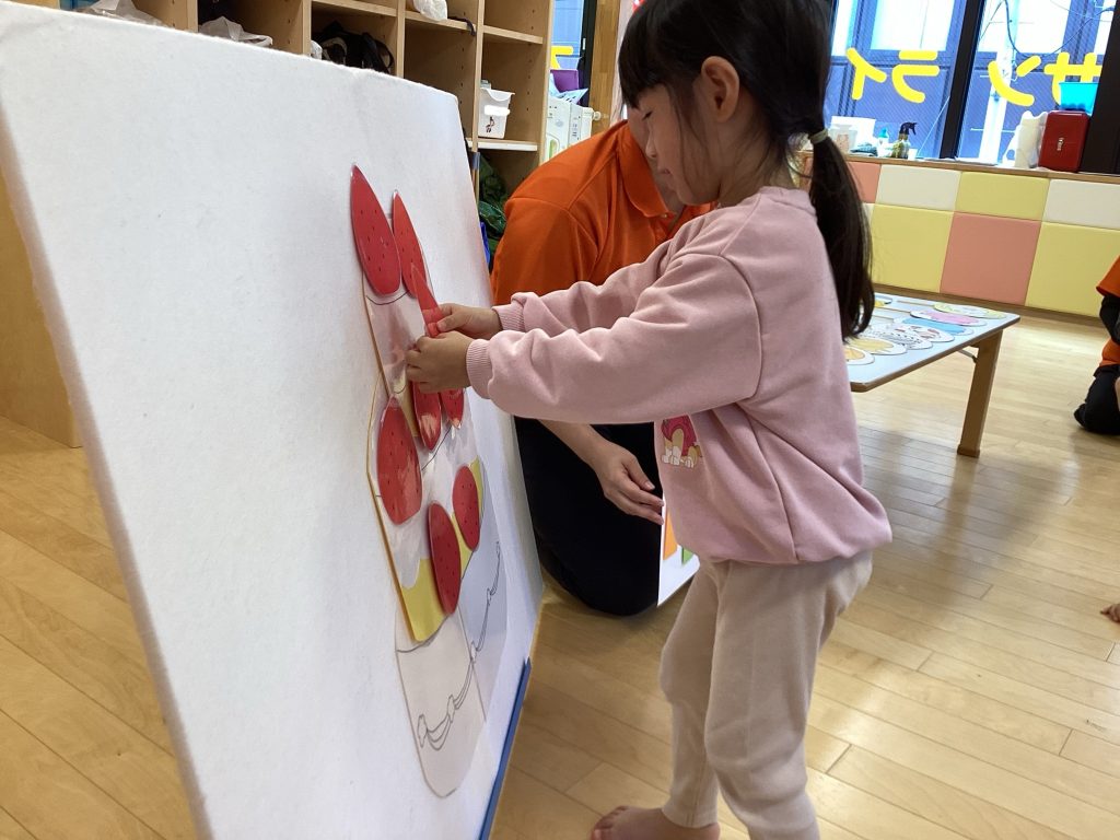保育者の出し物の後にはみんなでケーキのデコレーション🍓