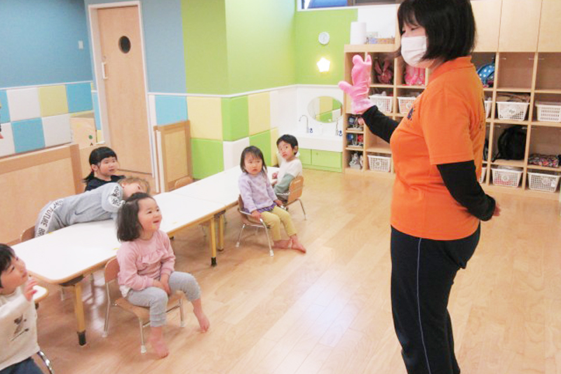 サンライズキッズ野洲園では、子どもたちの月齢にあった英語の活動に力を入れており、0〜2歳までの子どもたちがリズム遊びや歌を通して英語に楽しく触れる機会を大切にしています。