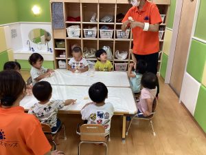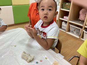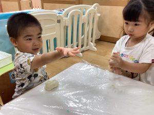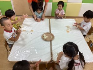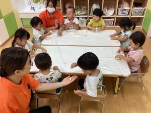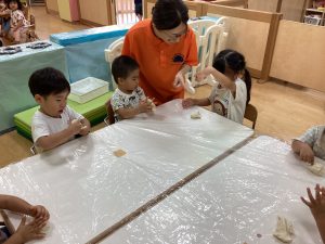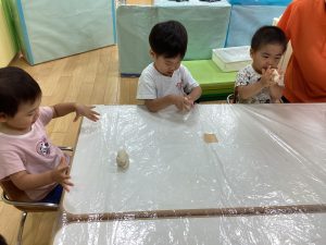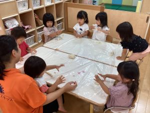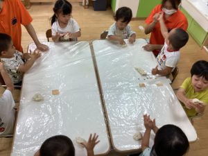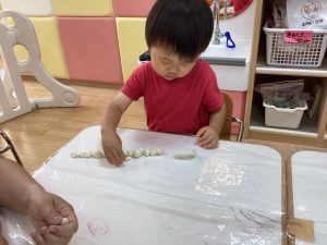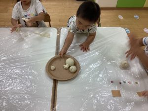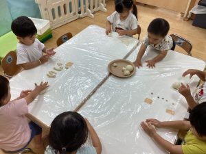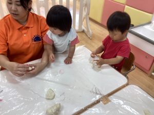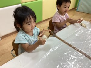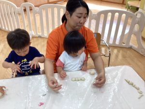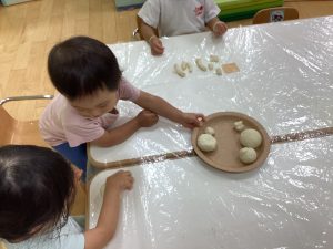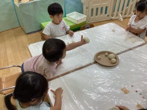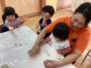 子どもたちと一緒に小麦粉粘土でお月見団子を作りました。