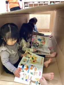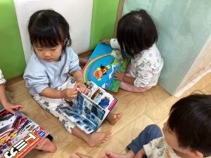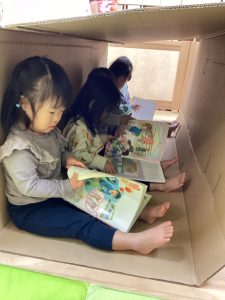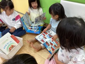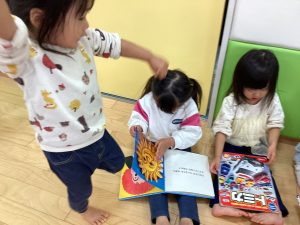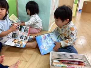 子どもたちは自然と好きな絵本を手に取り一人で見たり、友だちと読み合ったり