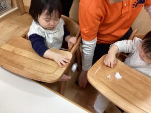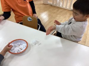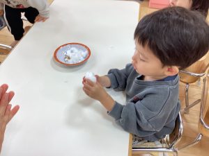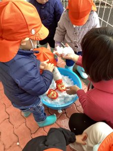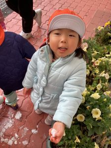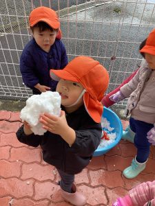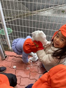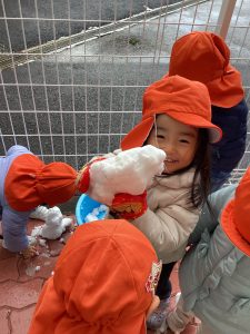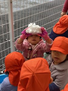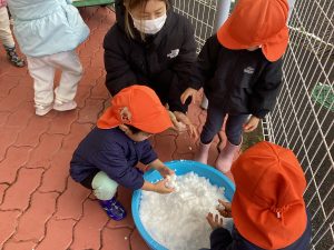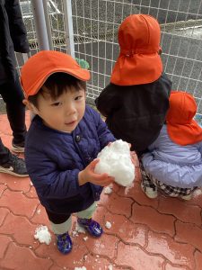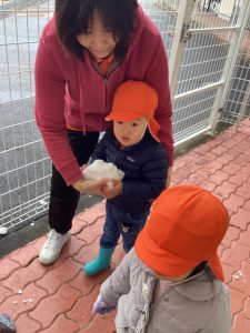 数日前に雪が降り、保育園でも雪に触れました❄️