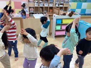 音楽に合わせて体を動かします。