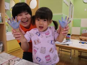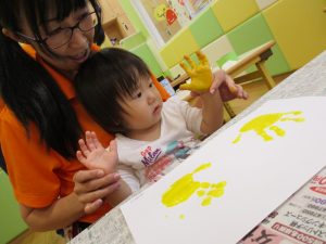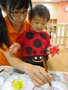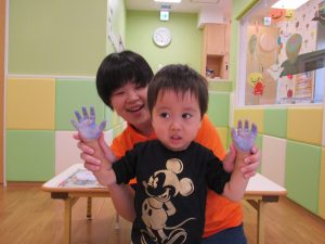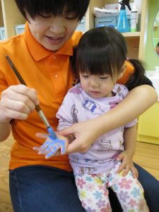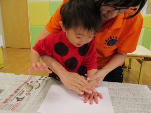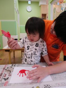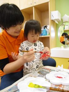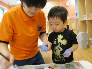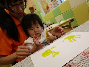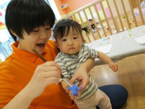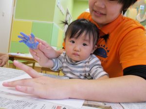 初めての製作に興味津々で手に絵の具がつくと不思議な表情を見せる子が多くとても微笑ましかったです。