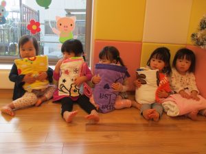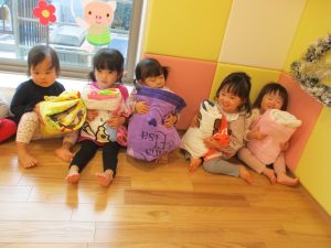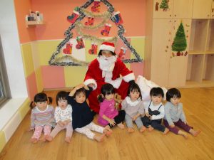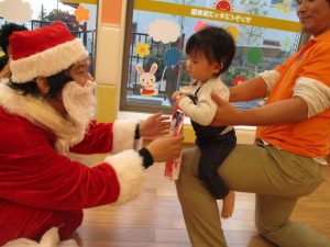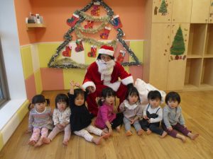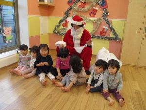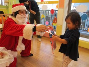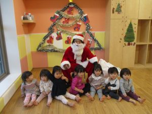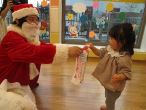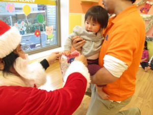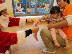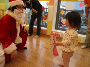 「サンタさんがプレゼントを持ってきてくれたんだよ」と先生がお話をすると子ども達は落ち着き、プレゼントを喜んで受け取りました。