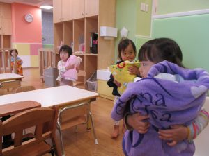 先生がクルクルと巻いたお昼寝タオルを両手に抱え自分のロッカーまで運びます。