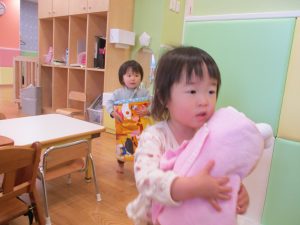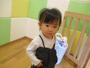 0歳児のお友達も2歳児のお兄さんお姉さんの真似をしながら一生懸命運んでいます。