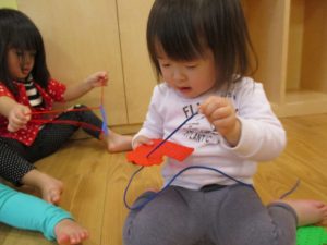井形ブロックやウッドレールや紐通しなど各々好きな玩具を選びイメージした物を上手に作り上げていました。