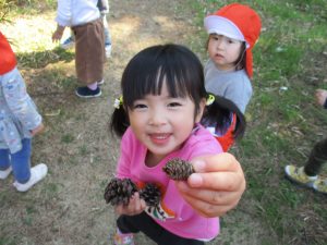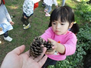 秋の自然物ですが大きな松ぼっくりがまだ落ちておりました。