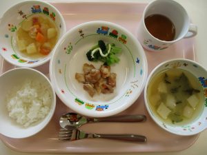 ご飯 味噌汁 照り焼きチキン ベーコンと野菜の
