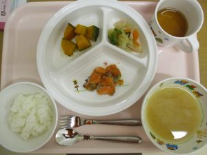 ご飯 味噌汁 鮭の香り味噌焼き 野菜炒め かぼちゃの甘辛煮