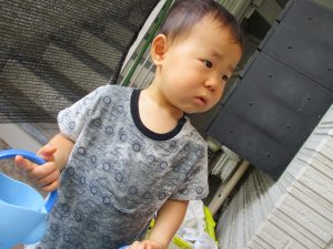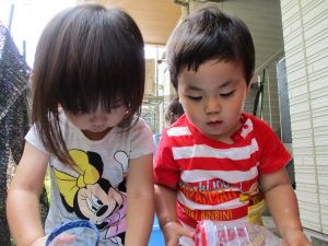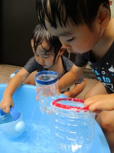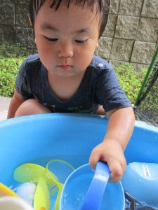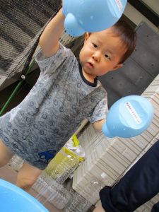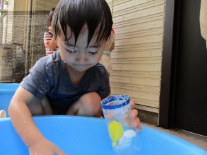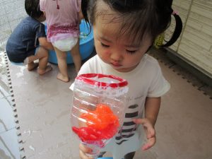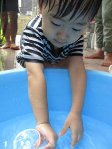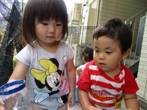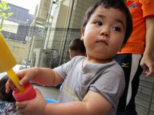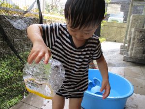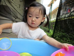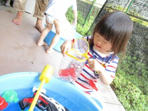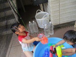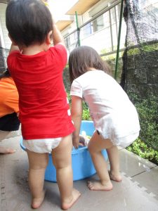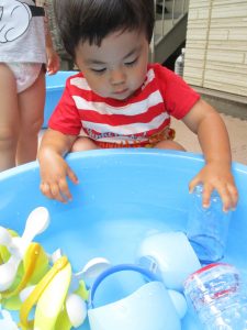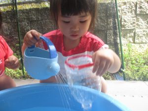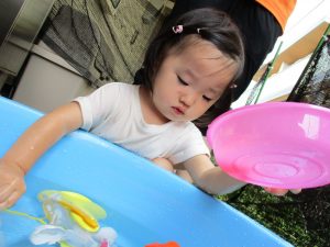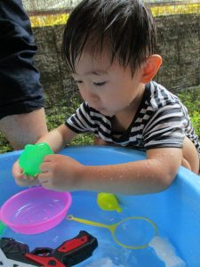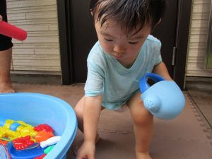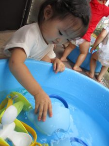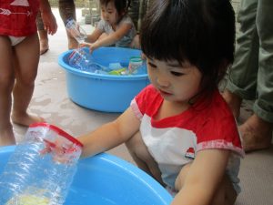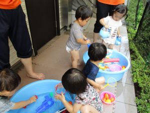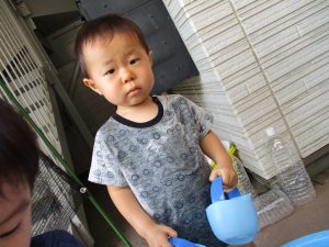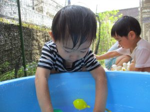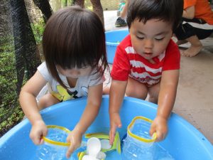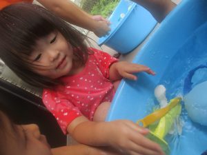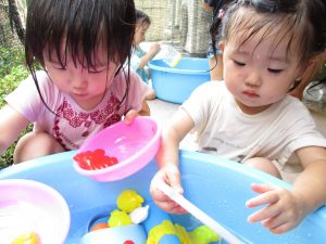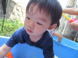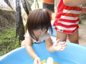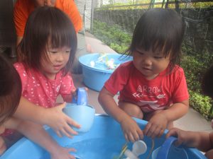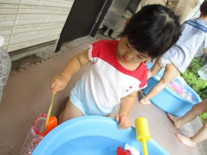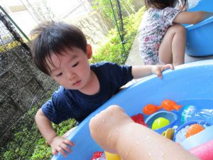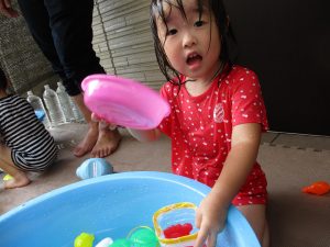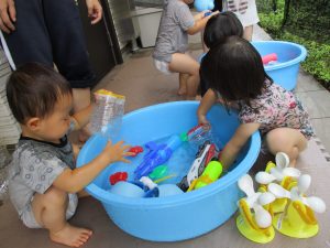 初めての水遊びの子もおり表情が固い場面が見られますが、少しずつ遊びに慣れていき思い思いの水遊びを堪能できればと思います。