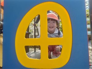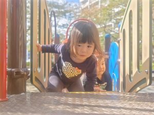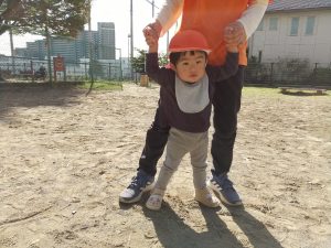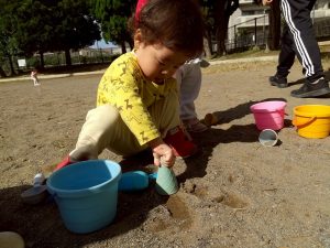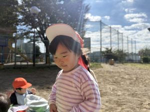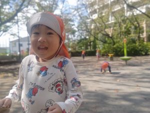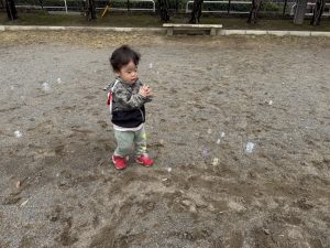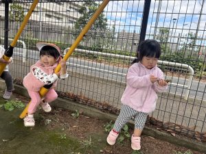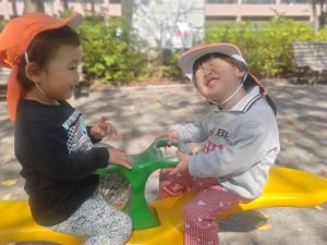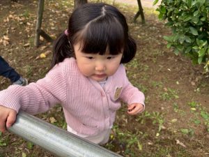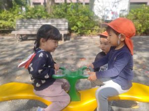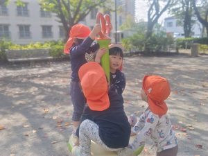固定遊具やゴムボールを使用してたくさん体を動かしたり、ままごと遊びや自然物探しに夢中でした。