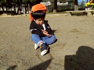 公園内で拾い集めた自然物を使用して、砂場でのままごと遊びを存分に楽しんでおりました。